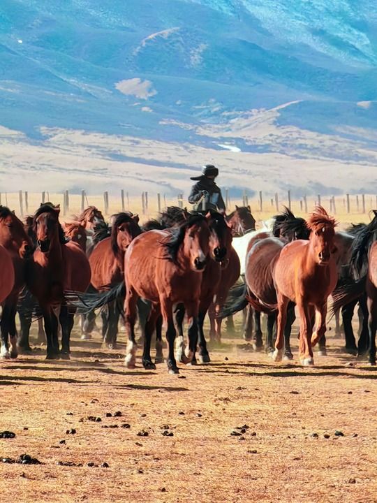 9点半,体弱的马群已饮水归来。此时,大队马群方才正式出发。蹄声清脆,富有节奏,牧马人之间依靠口哨与手势交流,不过分驱赶,不过度干预。马识途,头马领路,整个马群在看似随意的引导中有序流动。
