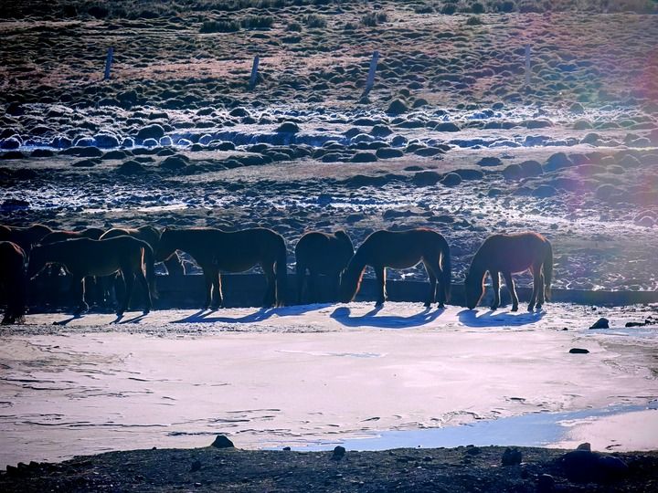 上午10点,我跟着大队马群,绕过冰封沉寂的鸾鸟湖,沿着祁连山融雪汇成的溪流向上游走,眼前便出现一段仍在流动的河面。寒冬未能将其锁住,水声潺潺,水面清亮,成了马群在寒冬中难得的饮水处。