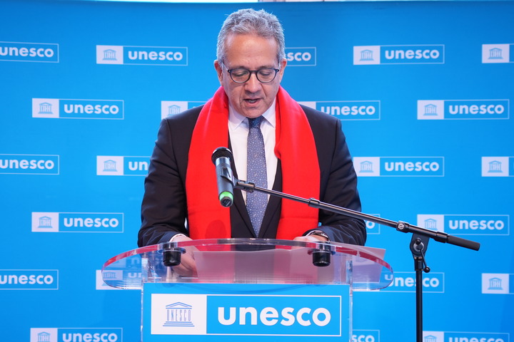 2月10日,在位于法国巴黎的联合国教科文组织总部,联合国教科文组织总干事埃纳尼在春节庙会活动中致辞。新华社记者孙鑫晶摄